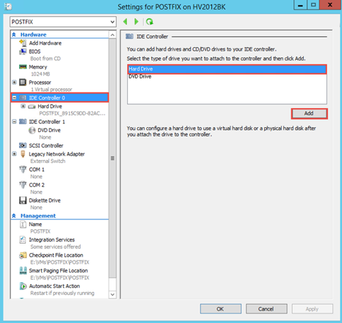 First up open the settings for your Virtual Machine and find and click on IDE Controller 0, then click Add.