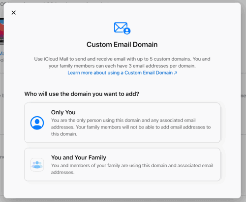 To be able to add a custom domain you will need to have an iCloud+ account.